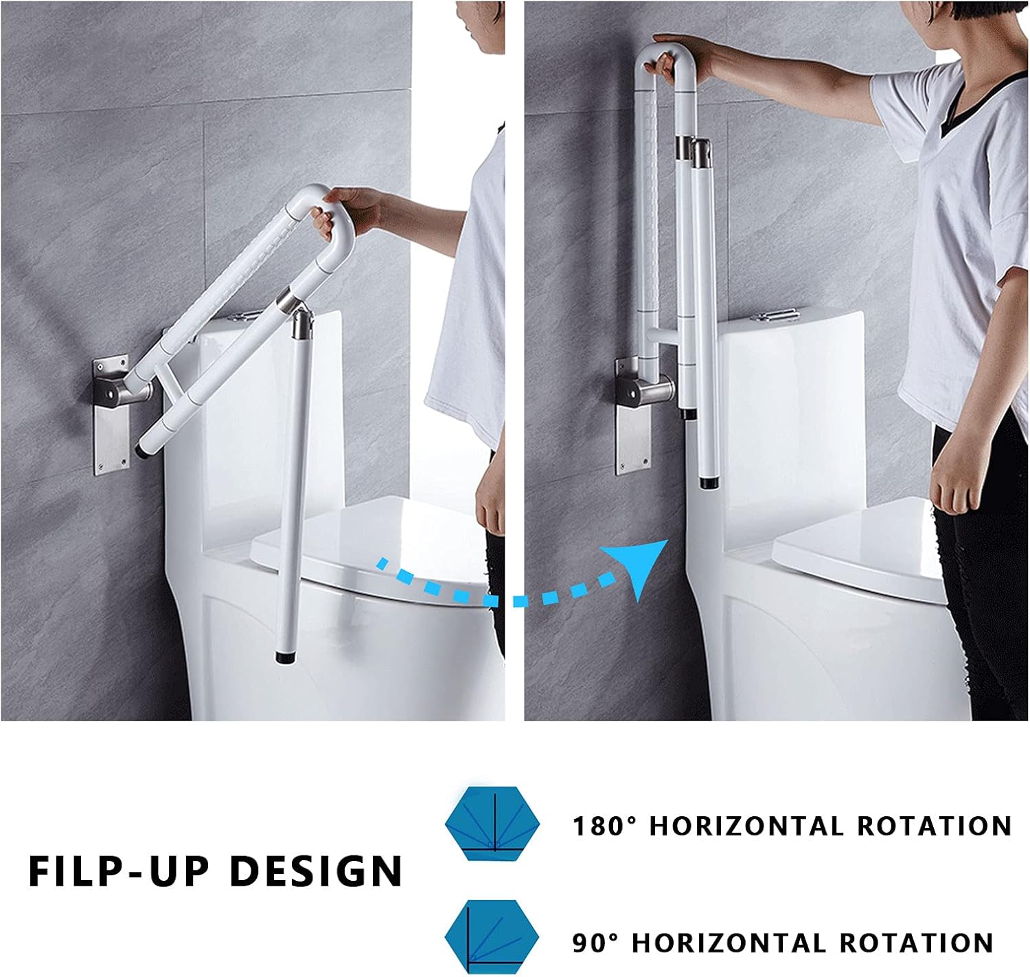 - Main courante pliable: Avec un mécanisme de rotation horizontale à 180 ° ou vertical à 90 °, ce rail de support de sécurité peut être facilement plié vers le haut/bas pour économiser de l’espace lorsqu’il n’est pas nécessaire.