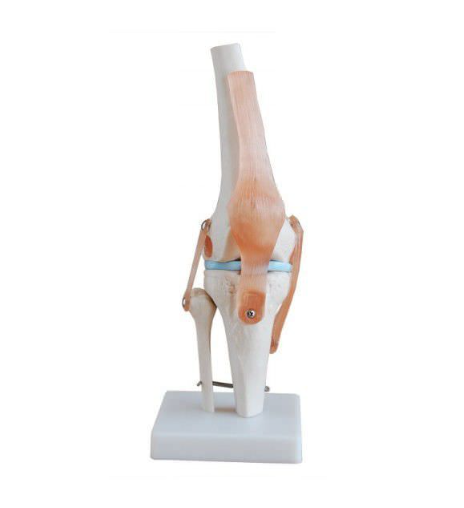 Le modèle comprend une partie du fémur, du tibia et une partie du péroné ; il inclut également le ménisque, la rotule avec le tendon du quadriceps et les ligaments articulaires, dont le LCA et le LCP. Livré sur un support amovible pour une étude ou une présentation aisée.