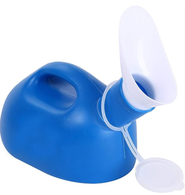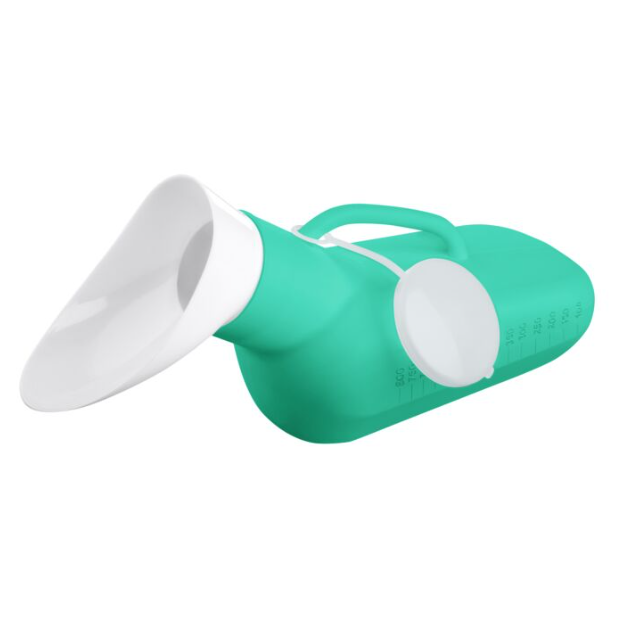 Urinal gradué, utilisable aussi bien par les hommes que par les femmes. Avec couvercle hermétique. Capacité 1 L.