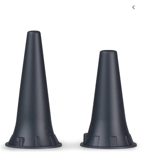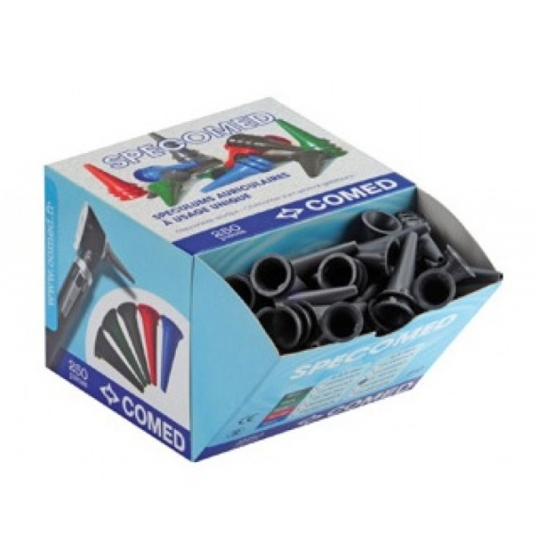 Speculums auriculaires couleur 2,5 mm ou 4 mm en plastique à usage unique, toutes tailles à installer sur un otoscope. Boite de 100