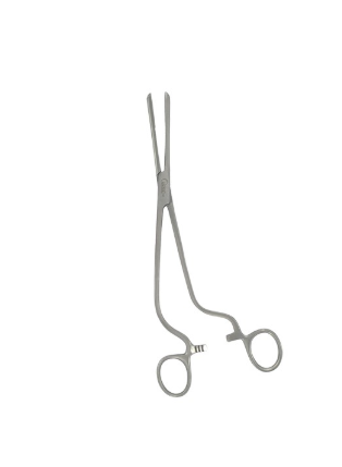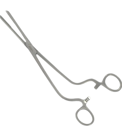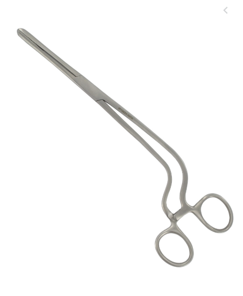 C’est une pince coudée porte tampon ou porte compresse permettant la désinfection du col de l’utérus, avant examen, et peut être utilisée plus généralement pour le soin des plaies.