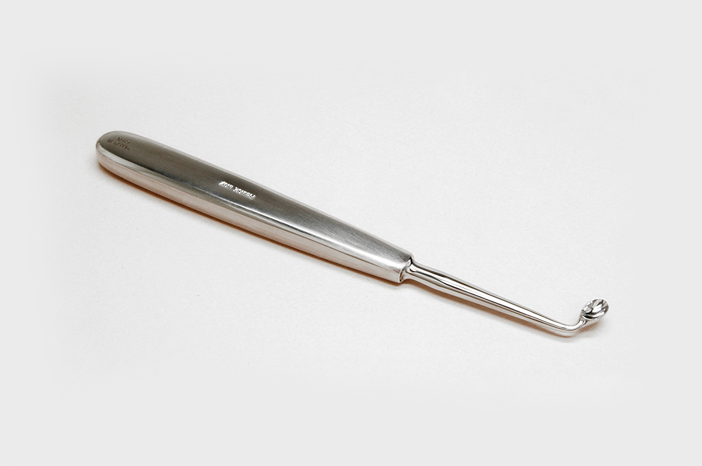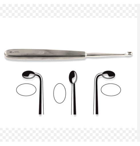 La curette à l’extrémité distale peut avoir différentes formes et tailles; l’extrémité proximale comporte une poignée.