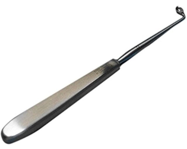 Instrument chirurgical manuel solide muni d’une longue tige dont l’extrémité distale ressemble à une cuillère.