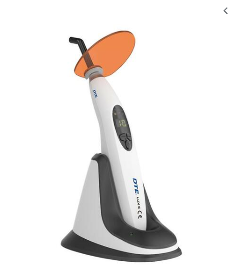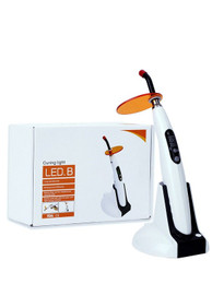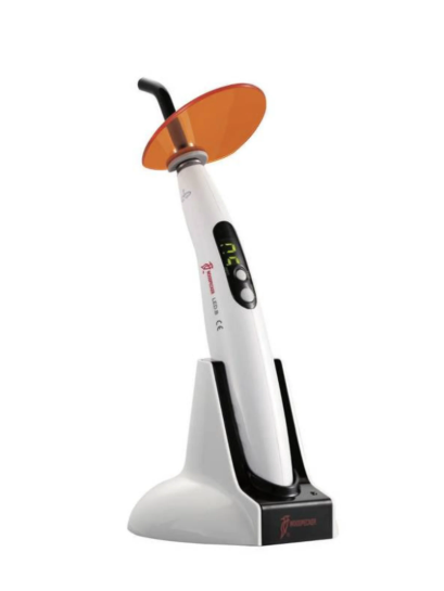 Lampe à photopolymériser sans fil et très légère Curing Light LED. B. Il y a 4 cycles différents de polymérisation. Une charge complète permet jusqu’à 500 polymérisations de 10s.