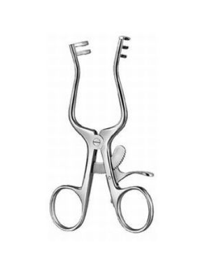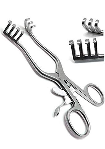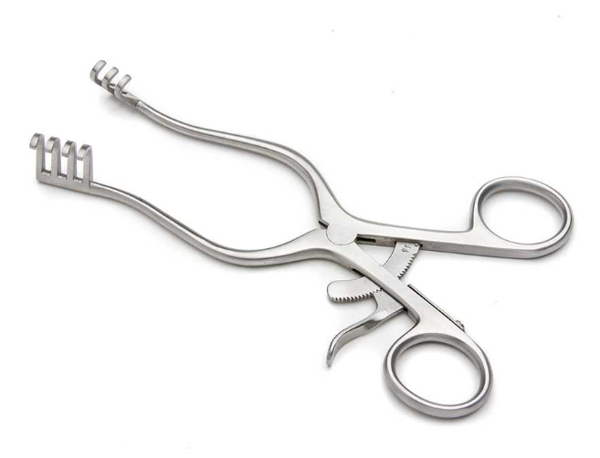 L’instrument peut ressembler à une paire de ciseaux à poignées annulaires ou à un dispositif à charnière à deux bras, avec des lames à grands angles, munies de crochets incurvés fenêtrés, souvent terminés par des extrémités pointues à l’extrémité distale pour saisir les tissus. Une fois mis en place, ce dispositif conserve sa position ouverte.