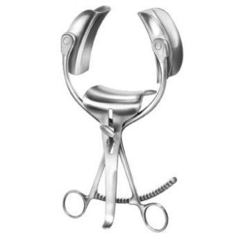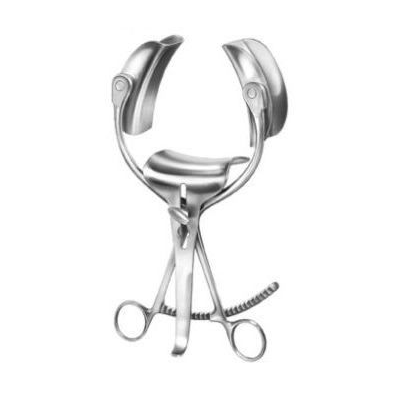 Instrument chirurgical à verrouillage automatique servant à séparer les bords d’une incision abdominale généralement durant une chirurgie profonde ou extensive, afin d’exposer ou d’accéder aux organes pour l’examen ou l’intervention. L’instrument ressemble à une très grande paire de ciseaux et a la forme d’une structure comportant deux lames opposées à bords émoussés, à angles larges et courbés au point de créer un crochet en forme de selle qui maintiennent l’abdomen ouvert. Il comporte une troisième lame mise sous tension à l’aide d’une série d’œillets et d’encoches.