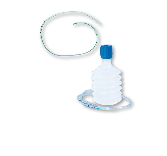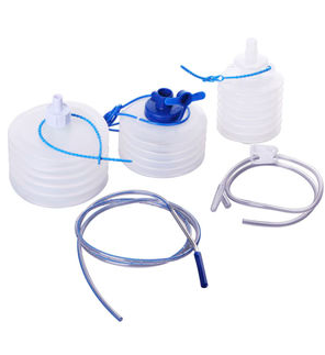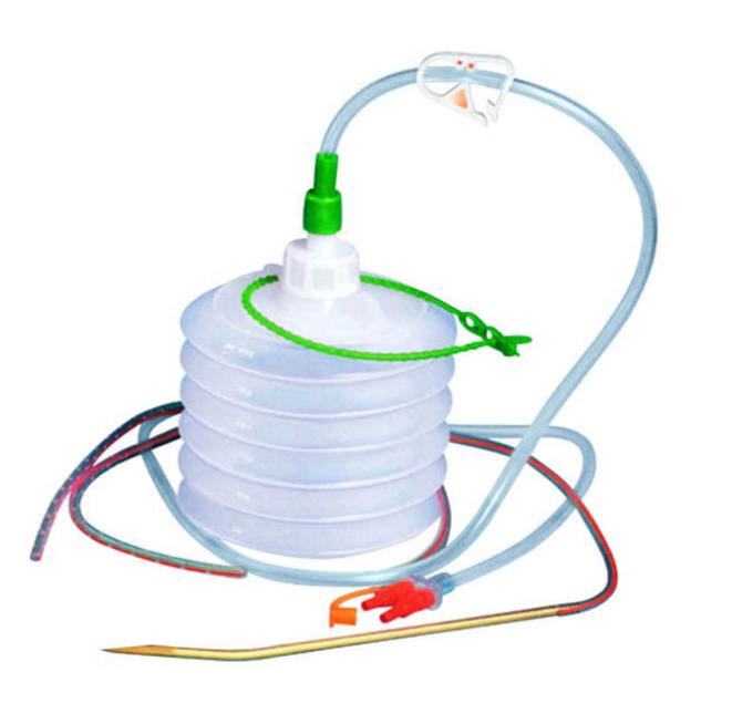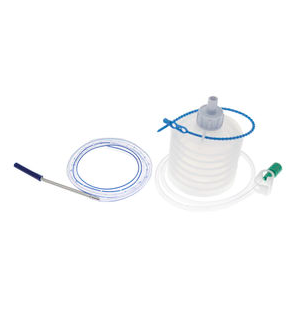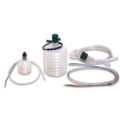 Système de drainage sous vide poussé, composé d’une bouteille pré-évacuée, d’un tuyau de raccordement et d’un drain Redon avec un trocart attaché.