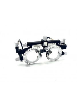 Lunette d’essai en métal et plastique noir de haute qualité utilisée par les professionnels de la vue, dont les opticiens, pour les examens de vue. Légère et confortable, la monture est conçue pour adapter jusqu’à 5 verres sur chaque œil simultanément – 3 sur la barre rotative avant et 2 sur la barre fixe arrière. Elle peut accueillir des verres d’essai d’un diamètre de 38 mm. La lunette d’essai permet de régler l’écartement des yeux, l’axe du cylindre, la hauteur de la pièce nasale, l’angle et la longueur du contour d’oreille.