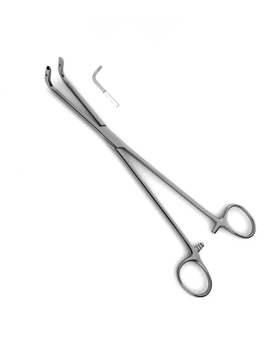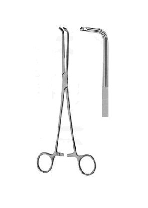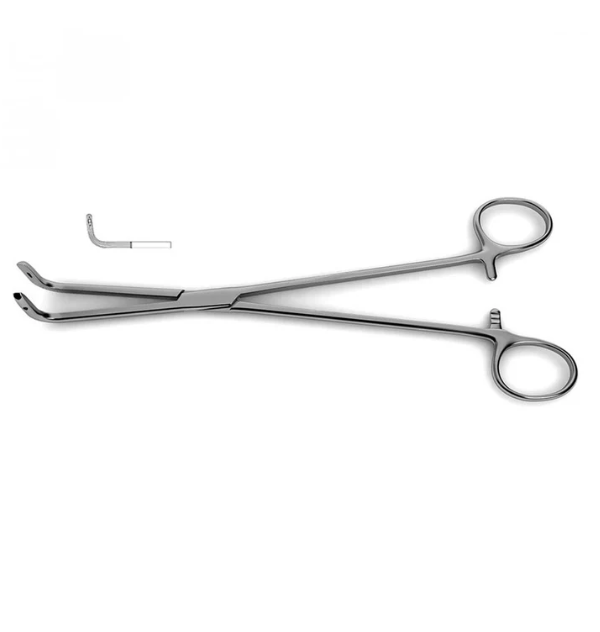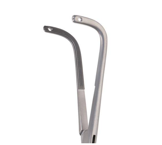 L’angle des mâchoires, ainsi que les dentelures longitudinales, contribuent à une prise ferme du tissu ou du vaisseau retenu lors d’opérations telles que la chirurgie thoracique.