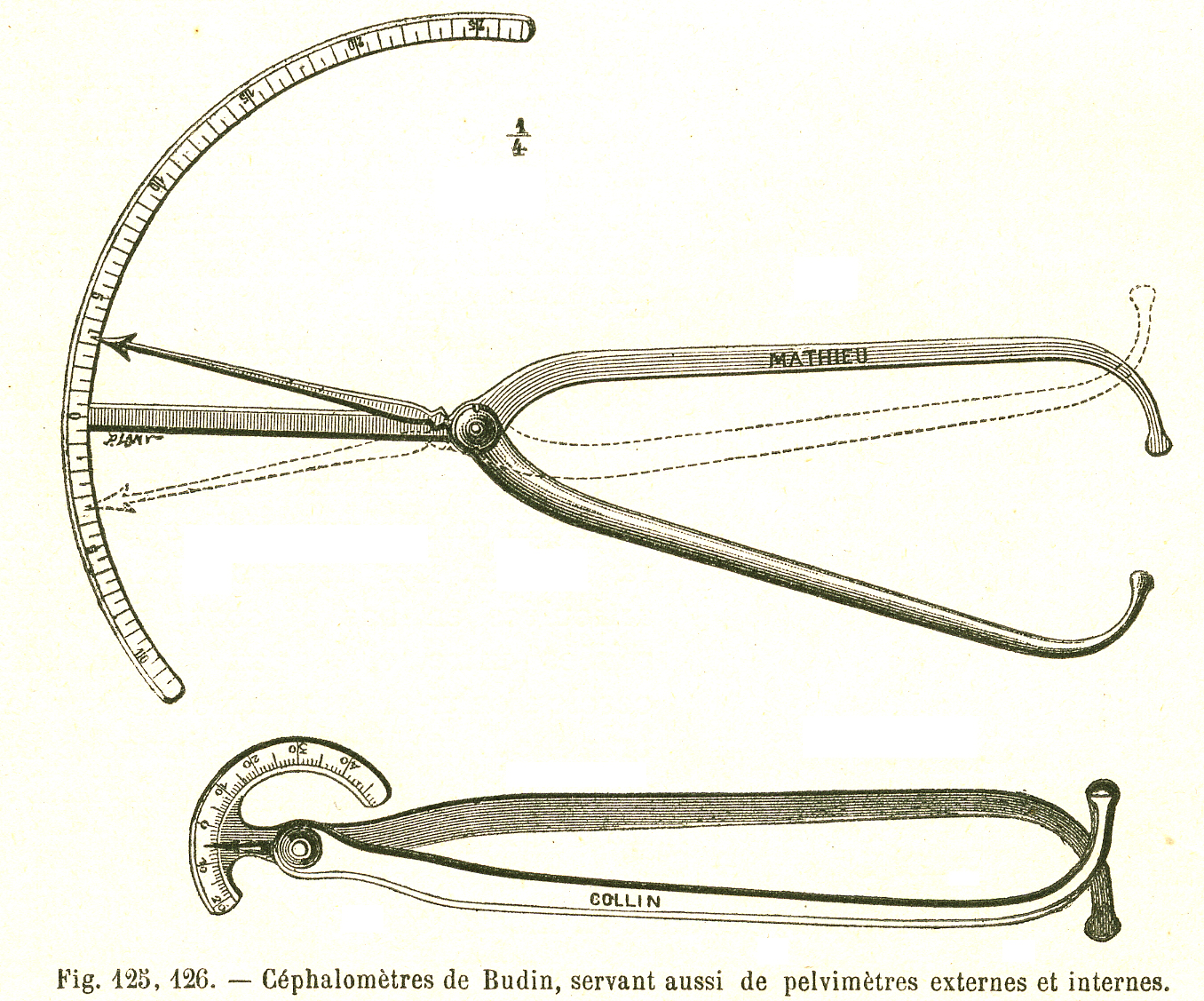 Composé de deux branches qu’on applique dans le vagin et qu’on écarte, l’une en avant jusqu’au pubis, l’autre en arrière jusqu’au promontoire pour mesurer directement le diamètre sacro-pubien. Ces instruments sont mauvais, parce que le vagin ne peut être distendu à ce point et, quand on essaie, on provoque des douleurs intolérables.