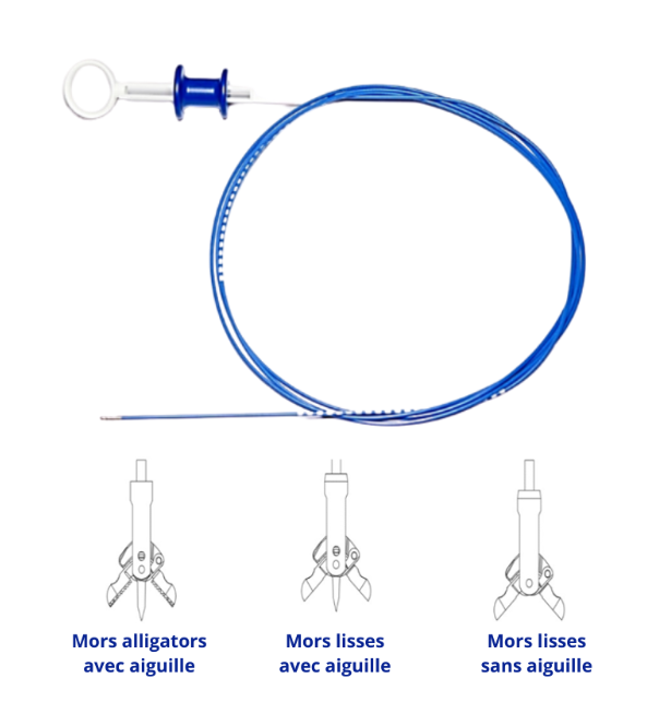 Pinces à biopsie stériles semi-rigides disponibles en 10 cm, 18 cm, et 31 cm, avec mors large de 7 mm pour une précision accrue.