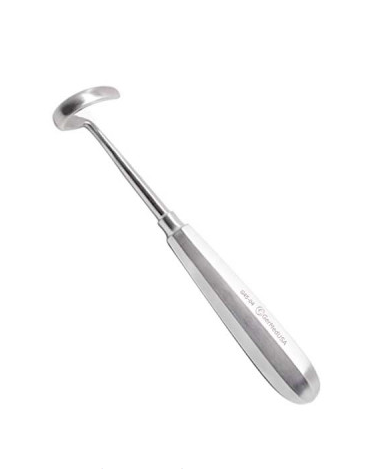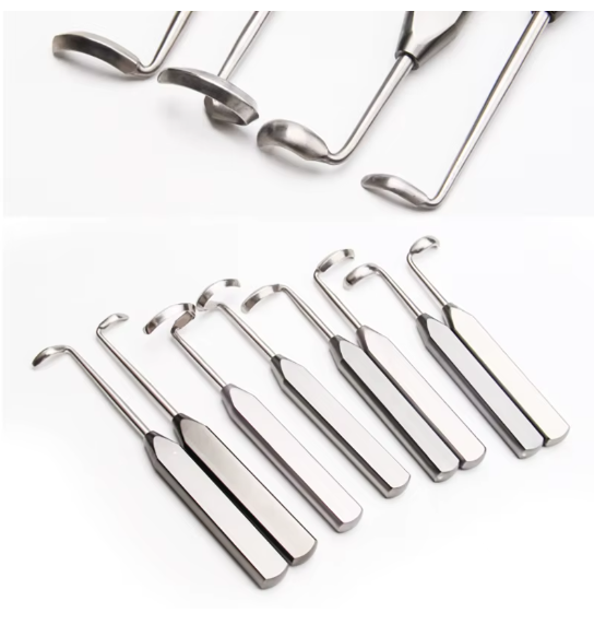 Leur manche en forme de bulbe se prolonge par un crochet légèrement spiralé, et leur section en forme de lame permet de racler une côte lors d’une néphrectomie.