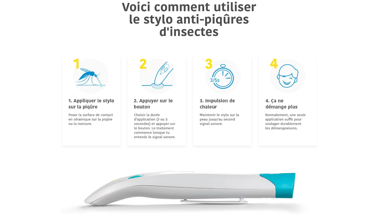 - Fini les patch anti-moustique, optez pour le stylo anti-moustique électrique pour le traitement symptomatique des piqûres de moustique, d’abeille, de guêpe, de frelon ou de taon.