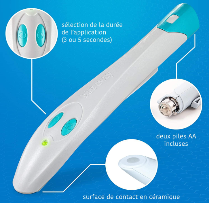 - Le stylo piqure bite away agit contre les démangeaisons, les douleurs et les gonflements – testé dermatologiquement et sans produit chimique – surface de contact en céramique désinfectable.