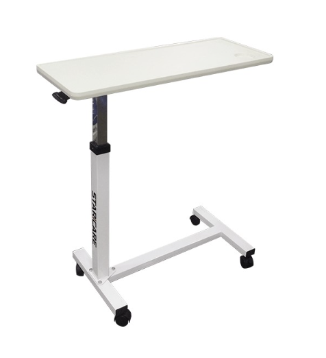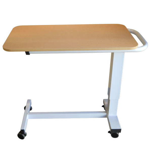 La table de lit A est équipée d’un grand plateau réglable en hauteur par vérin et de 2 roulettes à freins.