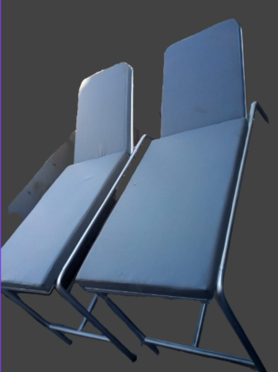 Têtière et siège rembourrés de mousse très haute densité (30kg/m3), dont l’épaisseur est de 5 cm, recouverts de tissus plastifié lavable ignifugé (classement de résistance au feu : M1).