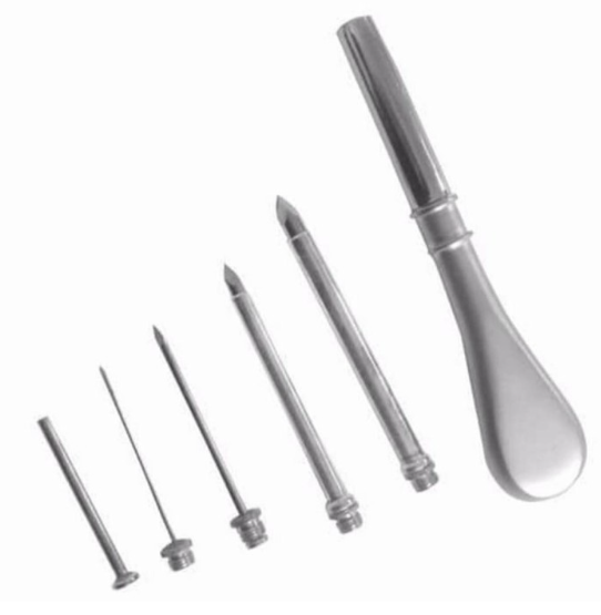 À cette fin, l’instrument comporte une pointe pointue à trois coins qui sectionne facilement les tissus mous. De plus, l’appareil comprend quatre pointes dont les diamètres varient de 1.7 à 6.0 mm. De plus, toutes les pointes sont interchangeables et possèdent une pointe à rainure hélicoïdale à visser dans la poignée.