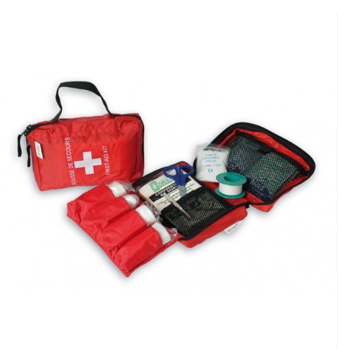 - 5 Compresses stériles 5 x 5 cm3 Compresses non adhérentes de 10 x 10 cm2 Bandes hydrophile 7,5 cm x 4 m5 Pansements adhésifs 19 x 38 mm15 Pansements adhésifs 25 x 72 mm1 Rouleau de sparadrap 2,5 cm x 5 m2 Paires de gants en vinyle8 lingettes alcoolisées1 paire de petits ciseaux d’urgence1 Pince à écharde6 Epingles de sûreté1 Bandage triangulaire1 Masque pour le bouche-à-bouche1 Couverture de survie