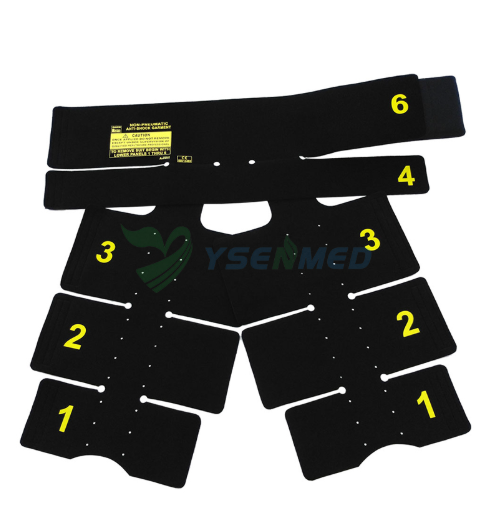 En forme de pantalon divisé en cinq ou six segments pour une application facile sur différentes parties du corps inférieur sous le diaphragme avec des attaches Velcro.